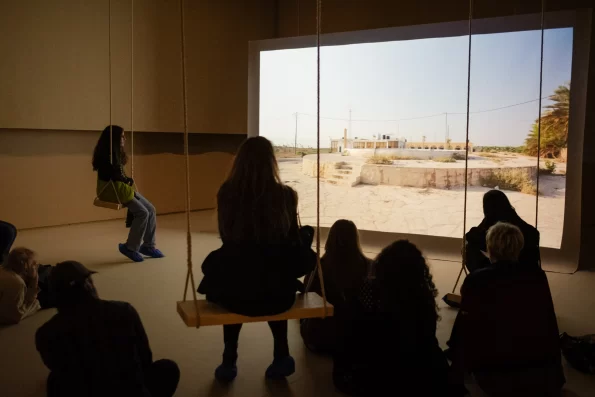 Vi starter kvelden i installasjonen Interrupted Futures, der vi ser Shuruq Harbs poetiske dokumentarskildring Al-Mashrou fra gyngende husker og møter vår omviser som introduserer oss for kunstnerskapet bak dette tankevekkende prosjektet.